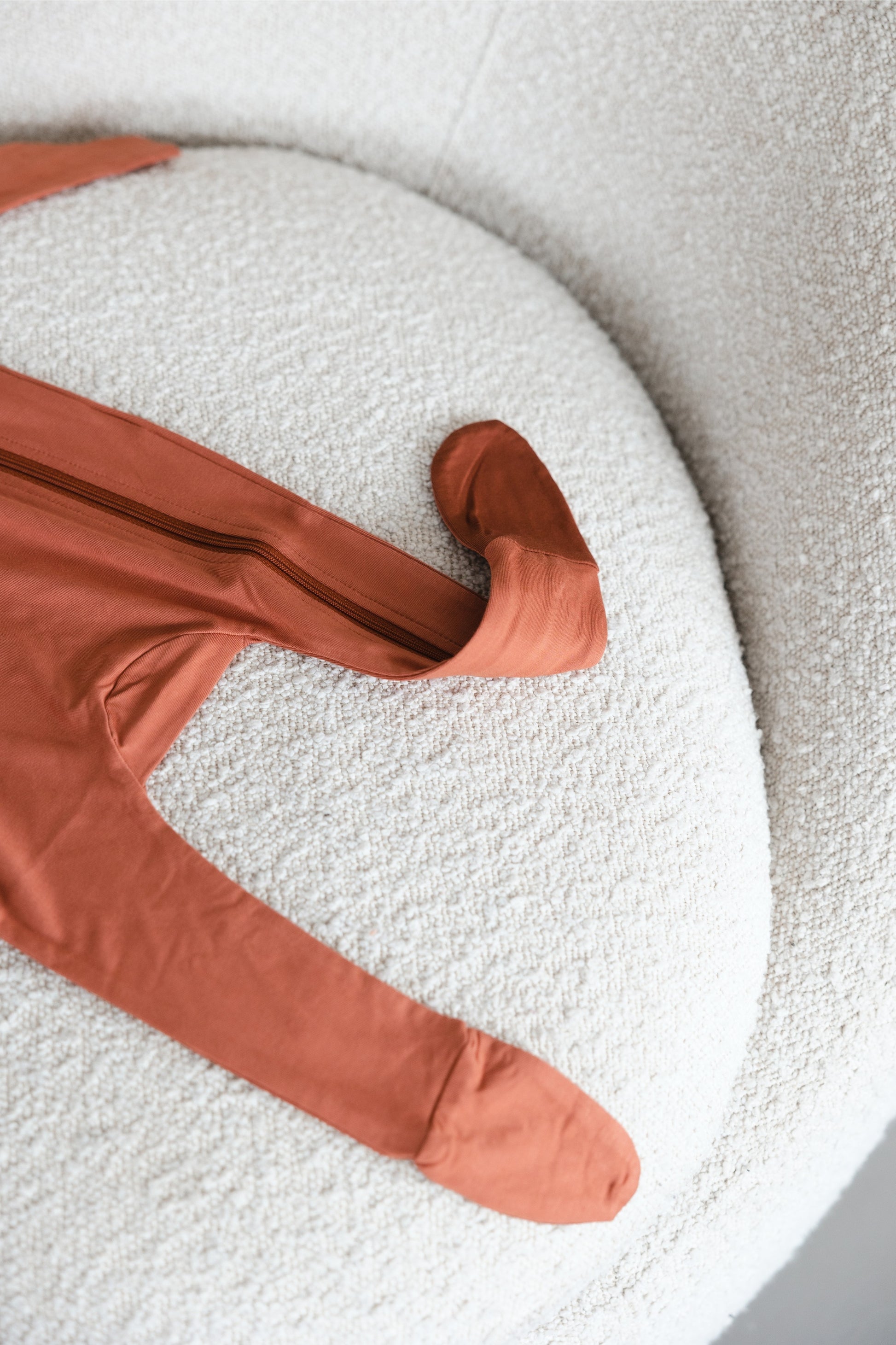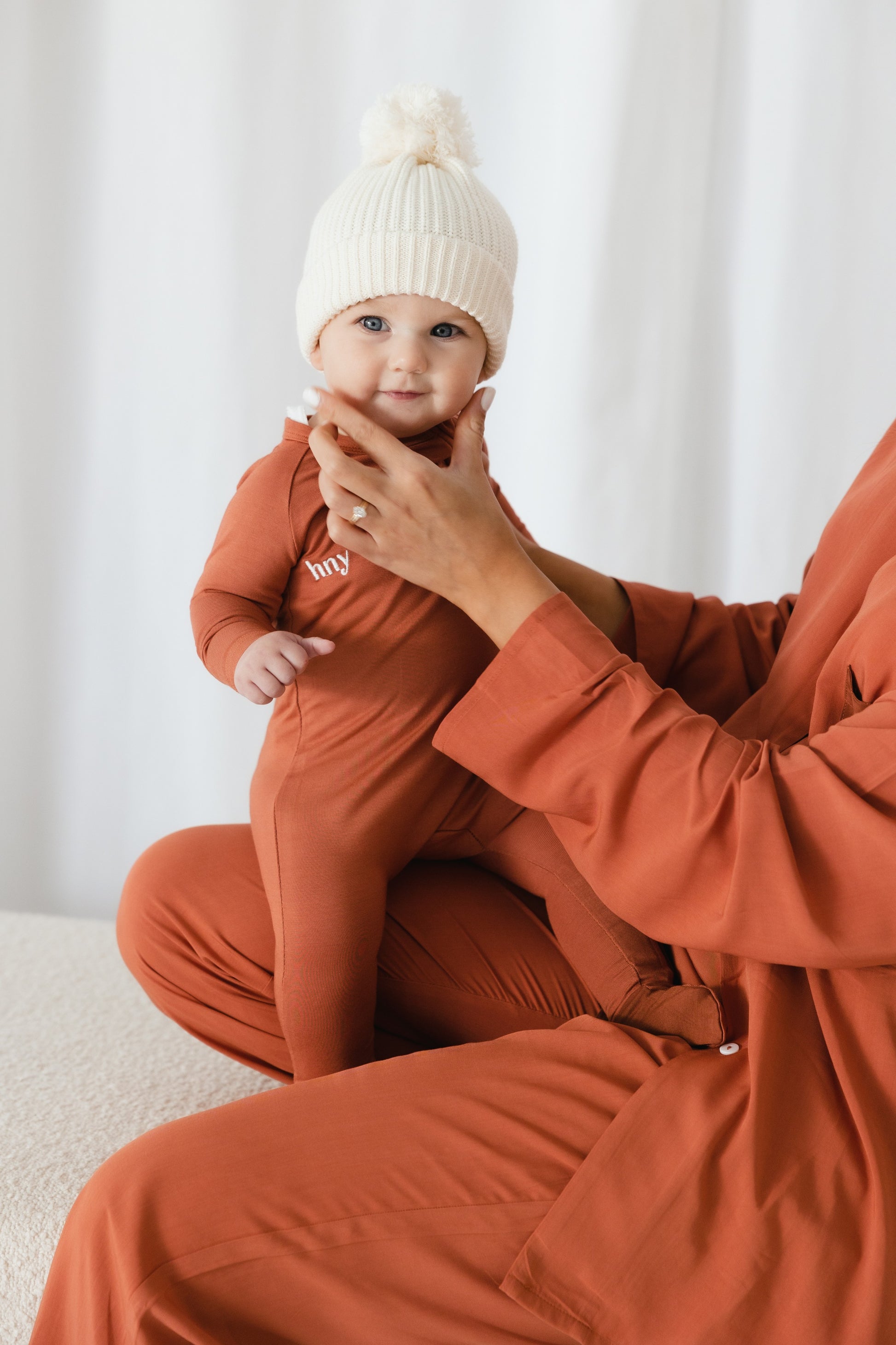 Bailey is one of our long-sleeve onesies for little hnys. It is the perfect addition to your little one's wardrobe. Our Bailey long-sleeve onesie is available in our exclusive Baked Clay and Brandy colours, allowing your little one to match Mum in style with our Alle set.