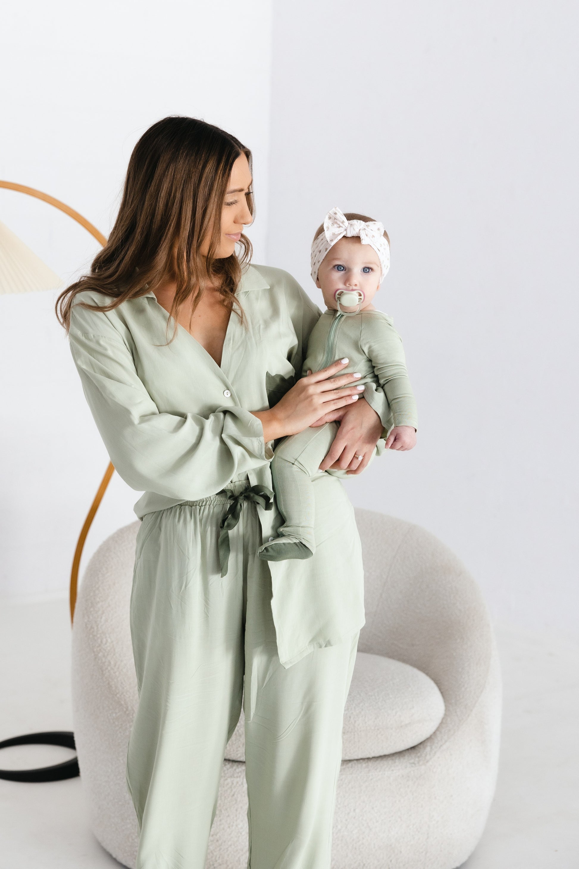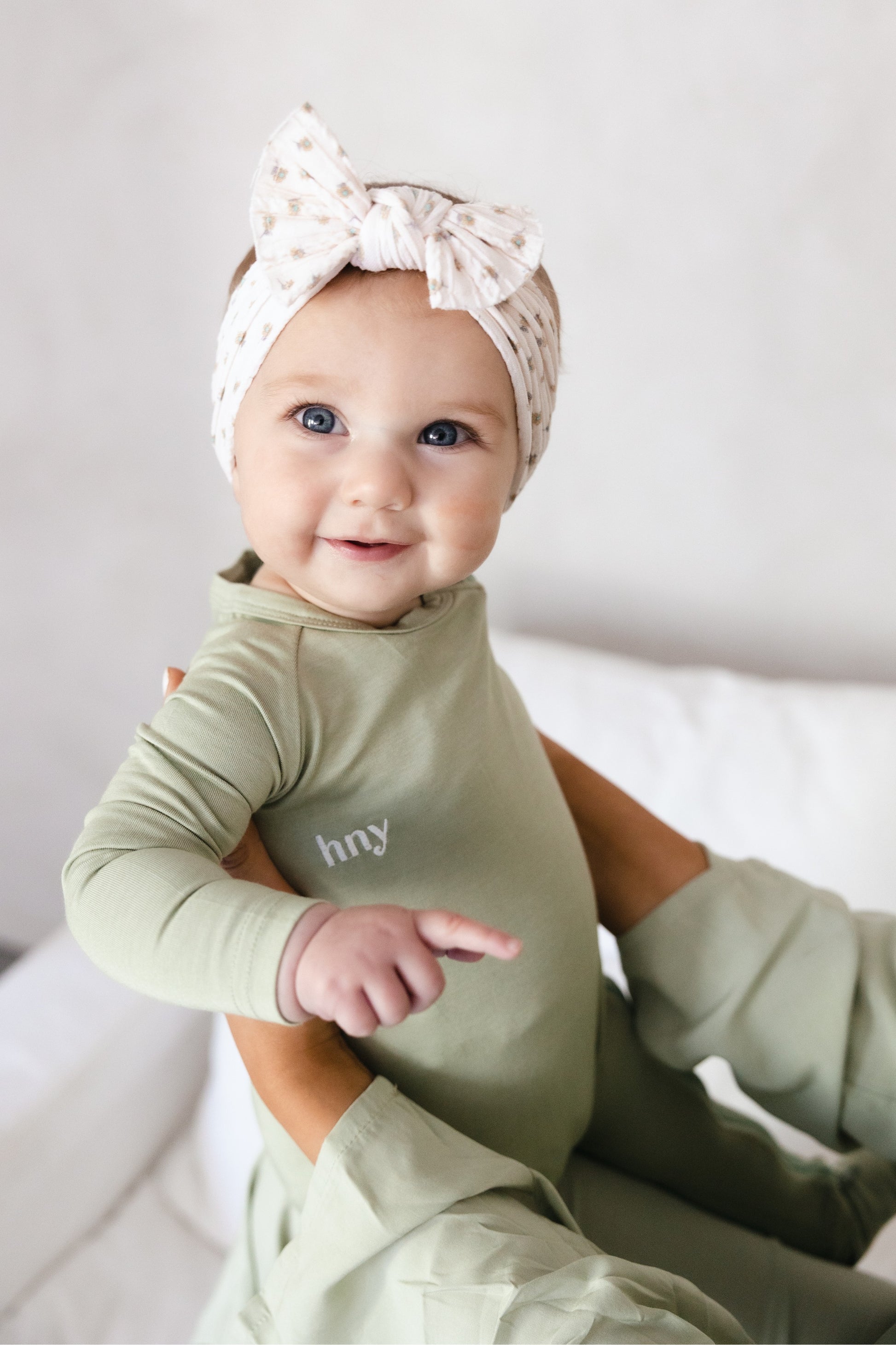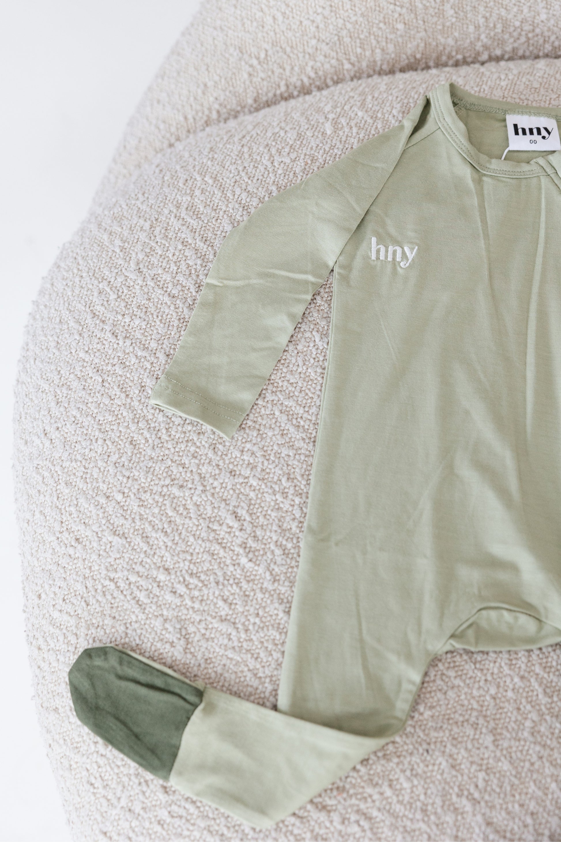 Bailey is one of our long-sleeve onesies for little hnys. It is the perfect addition to your little one's wardrobe. Our Bailey long-sleeve onesie is available in our exclusive Desert Sage and Clover colours, allowing your little one to match Mum in style with our Alle set.
